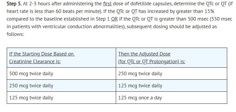 • Prior to initiation of dofetilide therapy, the patient should be advised to read the Medication Guide and reread it each time therapy is renewed in case the patient's status has changed. The patient should be fully instructed on the need for compliance with the recommended dosing of dofetilide capsules and the potential for drug interactions, and the need for periodic monitoring of QTc and renal function to minimize the risk of serious abnormal rhythms.