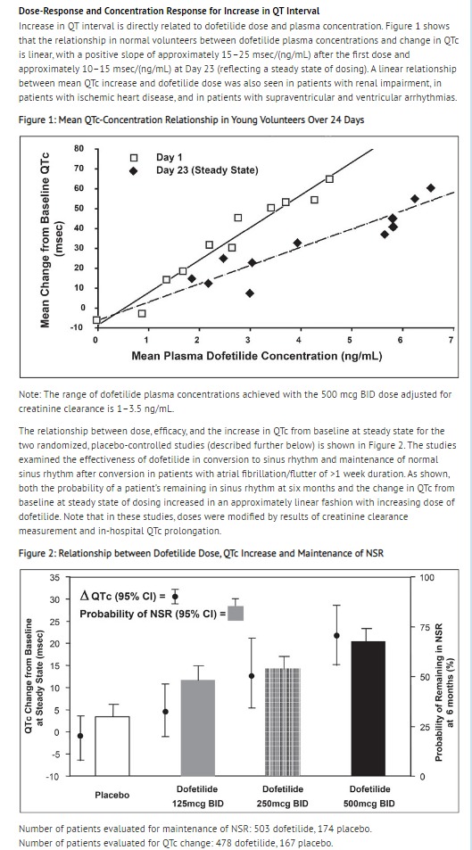 • The QT interval increases linearly with increasing dofetilide dose (see Figures 1 and 2 in CLINICAL PHARMACOLOGY and Dose-Response and Concentration Response for Increase in QT Interval).