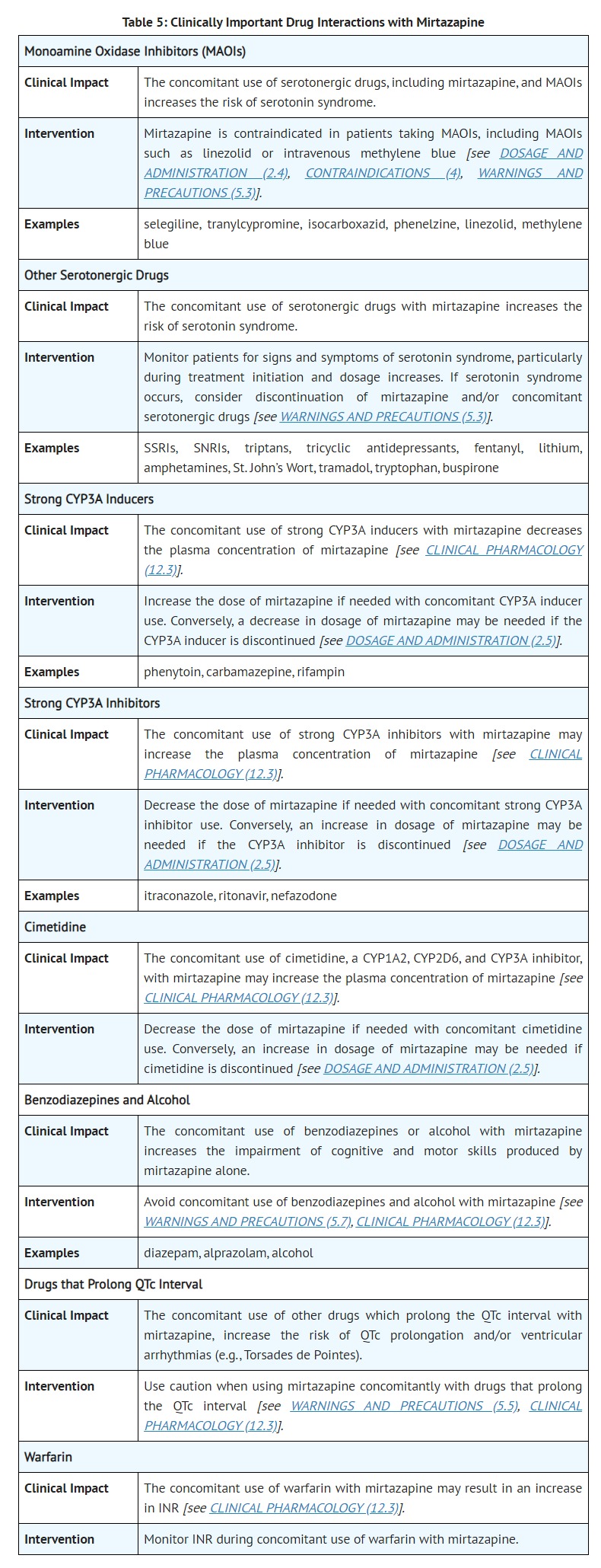 • The risk of QT prolongation and/or ventricular arrhythmias (e.g., Torsades de Pointes) may be increased with concomitant use of medicines which prolong the QTc interval (e.g., some antipsychotics and antibiotics) and in mirtazapine overdose [see WARNINGS AND PRECAUTIONS (5.5), ADVERSE REACTIONS (6.1, 6.2), Drug Interactions (7), and Overdosage (10)].