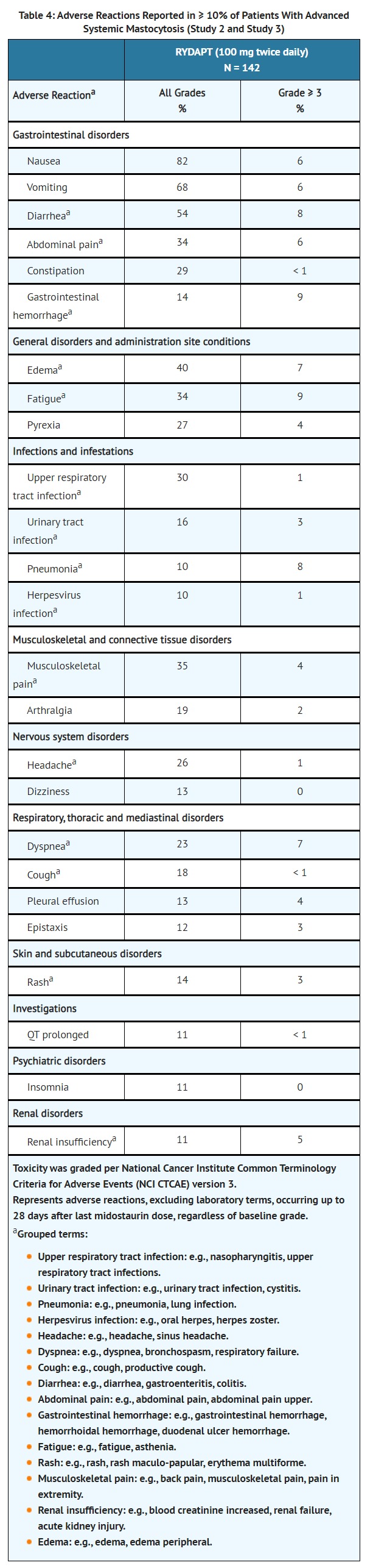 • Two single-arm, open-label multicenter trials (Study 2 and Study 3) evaluated the safety of RYDAPT (100 mg twice daily with food) as a single agent in 142 adult patients total with ASM, SM-AHN, or MCL. The median age was 63 (range 24 to 82), 63% had an ECOG performance status of 0 or 1, and 75% had no hepatic impairment (bilirubin and AST ≤ ULN) at baseline. The median duration of exposure to RYDAPT was 11.4 months (range 0 to 81 months), with 34% treated for ≥ 24 months.