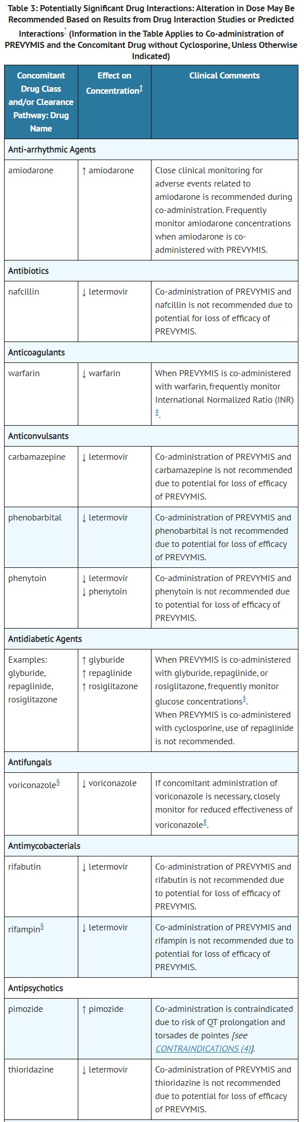 • Pimozide: Concomitant administration of PREVYMIS in patients receiving pimozide may result in increased concentrations of pimozide due to inhibition of cytochrome P450 3A (CYP3A) by letermovir, which may lead to QT prolongation and torsades de pointes [see WARNINGS AND PRECAUTIONS (5.1) and DRUG INTERACTIONS (7.2, 7.3)].