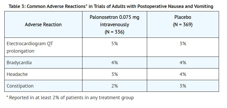 • The most common adverse reactions reported in at least 2% of adults receiving palonosetron 0.075 mg intravenously immediately before induction of anesthesia in 3 randomized placebo-controlled trials [see CLINICAL STUDIES (14.3)] are shown in Table 3. Rates of adverse reactions between palonosetron and placebo groups were similar. Some events are known to be associated with, or may be exacerbated by concomitant perioperative and intraoperative medications administered in this surgical population. A thorough QT/QTc study demonstrated palonosetron does not prolong the QT interval to any clinically relevant extent [see CLINICAL PHARMACOLOGY (12.2)].