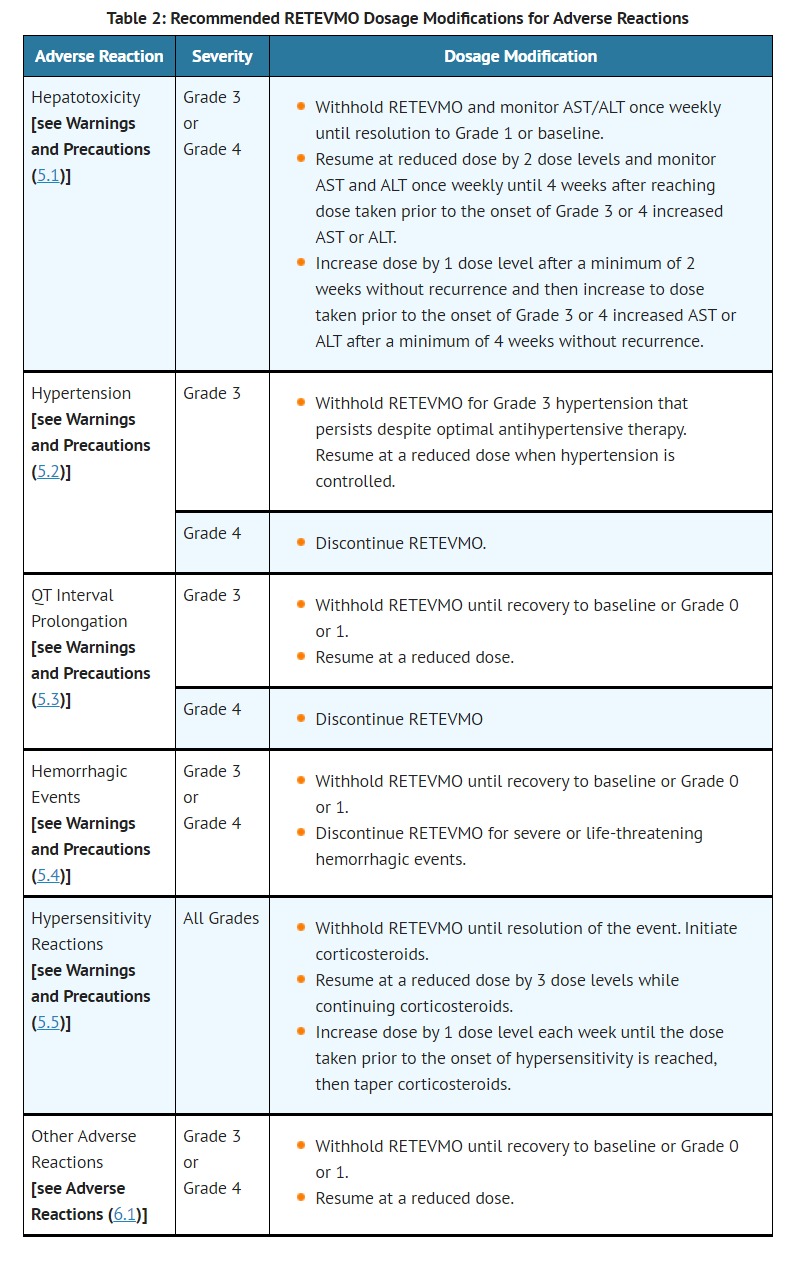 • Dose reductions due to an adverse reaction occurred in 31% of patients who received RETEVMO. Adverse reactions requiring dosage reductions in ≥ 2% of patients included ALT increased, AST increased, QT prolongation and fatigue.