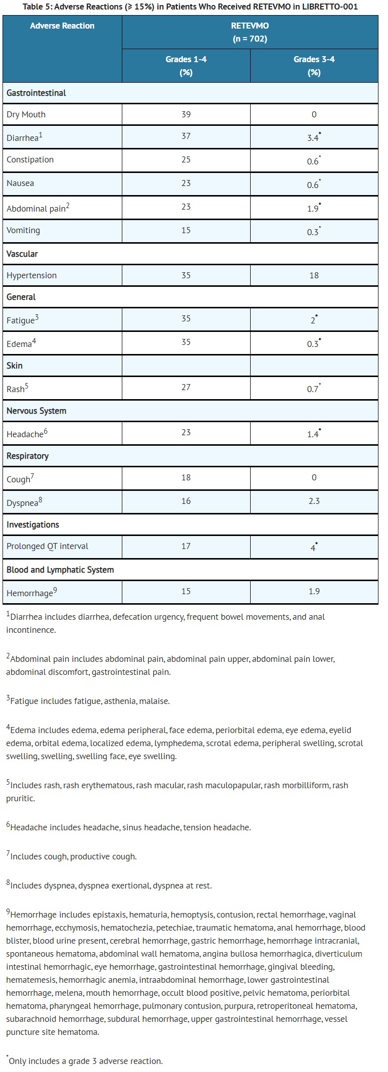 • Dosage interruptions due to an adverse reaction occurred in 42% of patients who received RETEVMO. Adverse reactions requiring dosage interruption in ≥ 2% of patients included ALT increased, AST increased, hypertension, diarrhea, pyrexia, and QT prolongation.