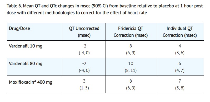 • In a separate postmarketing study of 44 healthy volunteers, single doses of 10 mg vardenafil hydrochloride resulted in a placebo-subtracted mean change from baseline of QTcF (Fridericia correction) of 5 msec (90% CI: 2,8). Single doses of gatifloxacin 400mg resulted in a placebo-subtracted mean change from baseline QTcF of 4 msec (90% CI: 1,7). When vardenafil hydrochloride 10mg and gatifloxacin 400 mg were co-administered, the mean QTcF change from baseline was additive when compared to either drug alone and produced a mean QTcF change of 9 msec from baseline (90% CI: 6,11). The clinical impact of these QT changes is unknown [see Warnings and Precautions (5.7)].