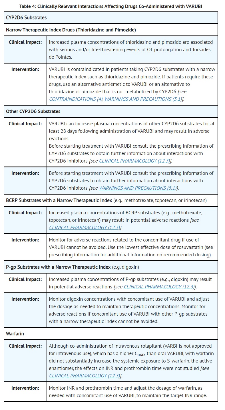 • VARUBI is contraindicated in patients taking CYP2D6 substrates with a narrow therapeutic index, such as thioridazine and pimozide. VARUBI can significantly increase the plasma concentrations of thioridazine and pimozide, which may result in QT prolongation and Torsades de Pointes [see WARNINGS AND PRECAUTIONS (5.1)].