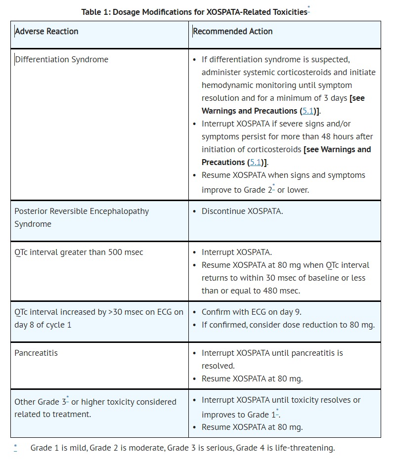 • XOSPATA has been associated with prolonged cardiac ventricular repolarization (QT interval). Of the 317 patients with a post-baseline QTc measurement on treatment with XOSPATA in the clinical trial, 1% were found to have a QTc interval greater than 500 msec and 7% of patients had an increase from baseline QTc greater than 60 msec. Perform electrocardiogram (ECG) prior to initiation of treatment with gilteritinib, on days 8 and 15 of cycle 1, and prior to the start of the next two subsequent cycles. Interrupt and reduce XOSPATA dosage in patients who have a QTcF >500 msec [see Dosage and Administration (2.3), Adverse Reactions (6.1) and Clinical Pharmacology (12.2)].