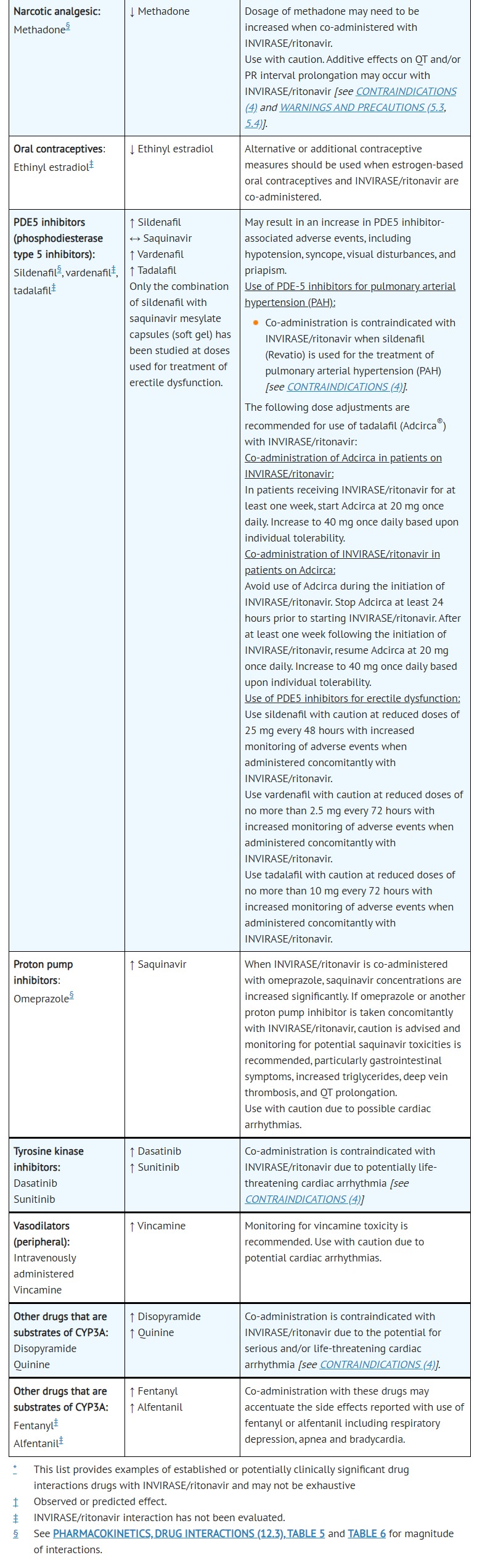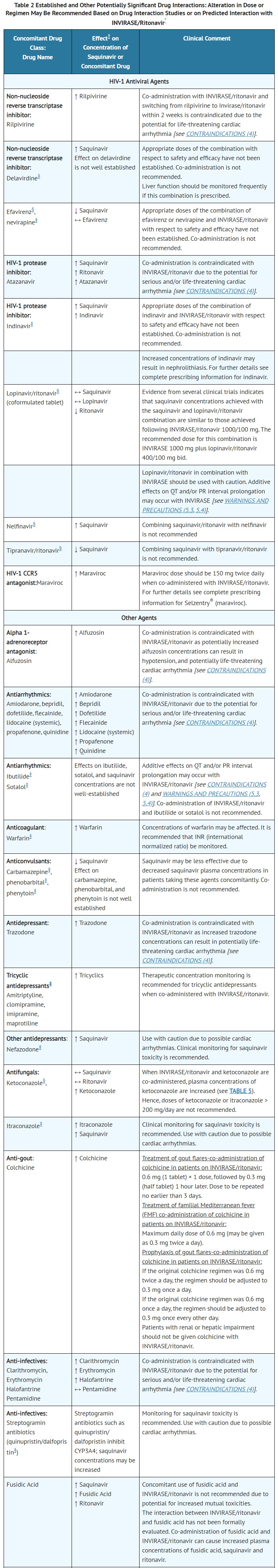 • For concomitantly used drugs, including antiretroviral agents used in combination with INVIRASE/ritonavir, physicians should refer to the complete product information for these drugs for dose adjustment recommendations and for information regarding drug-associated adverse reactions.