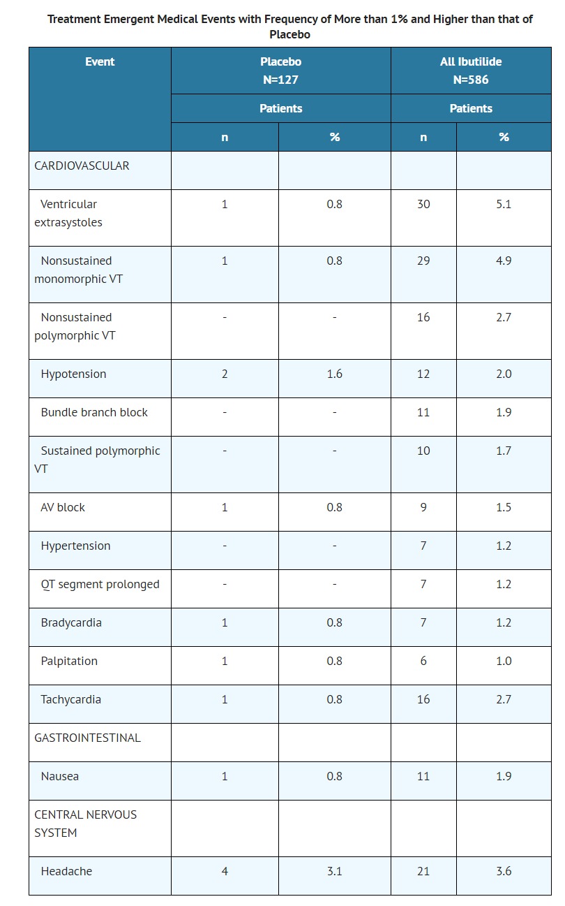 • Ibutilide fumarate injection can cause potentially fatal arrhythmias, particularly sustained polymorphic ventricular tachycardia, usually in association with QT prolongation (torsades de pointes), but sometimes without documented QT prolongation. In registration studies, these arrhythmias, which require cardioversion, occurred in 1.7% of treated patients during, or within a number of hours of, use of ibutilide fumarate injection. These arrhythmias can be reversed if treated promptly (see WARNINGS, PROARRHYTHMIA). It is essential that ibutilide fumarate injection be administered in a setting of continuous ECG monitoring and by personnel trained in identification and treatment of acute ventricular arrhythmias, particularly polymorphic ventricular tachycardia. Patients with atrial fibrillation of more than 2 to 3 days' duration must be adequately anticoagulated, generally for at least 2 weeks.