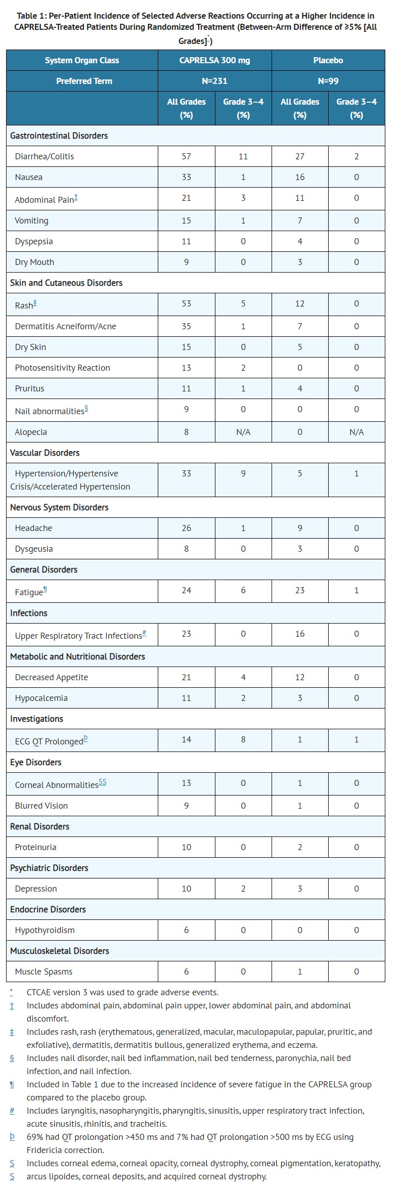 • Among CAPRELSA-treated patients, dose interruption occurred in 109 (47%) and dose reduction occurred in 83 (36%). Adverse reactions led to study treatment discontinuation in 28 of 231 patients (12%) receiving CAPRELSA and in 3 of 99 patients (3.0%) receiving placebo. Adverse reactions leading to permanent discontinuation in 2 or more (≥0.9%) patients treated with CAPRELSA were: asthenia (1.7%), rash (1.7%), diarrhea (0.9%), fatigue (0.9%), pyrexia (0.9%), elevated creatinine (0.9%), QT prolongation (0.9%), and hypertension (0.9%).