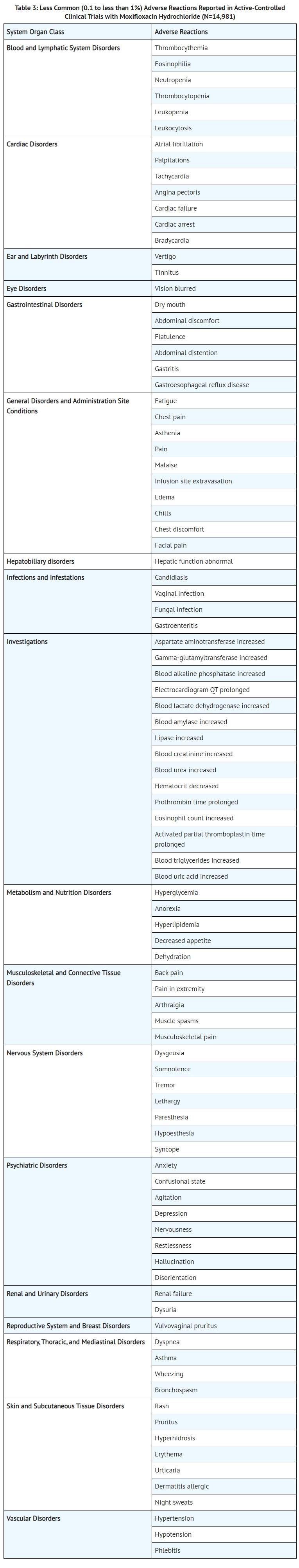 • In premarketing clinical trials, the rate of cardiovascular adverse reactions was similar in 798 moxifloxacin hydrochloride and 702 comparator treated patients who received concomitant therapy with drugs known to prolong the QTc interval. No excess in cardiovascular morbidity or mortality attributable to QTc prolongation occurred with moxifloxacin hydrochloride treatment in over 15,500 patients in controlled clinical studies, including 759 patients who were hypokalemic at the start of treatment, and there was no increase in mortality in over 18,000 moxifloxacin tablet treated patients in a postmarketing observational study in which ECGs were not performed.