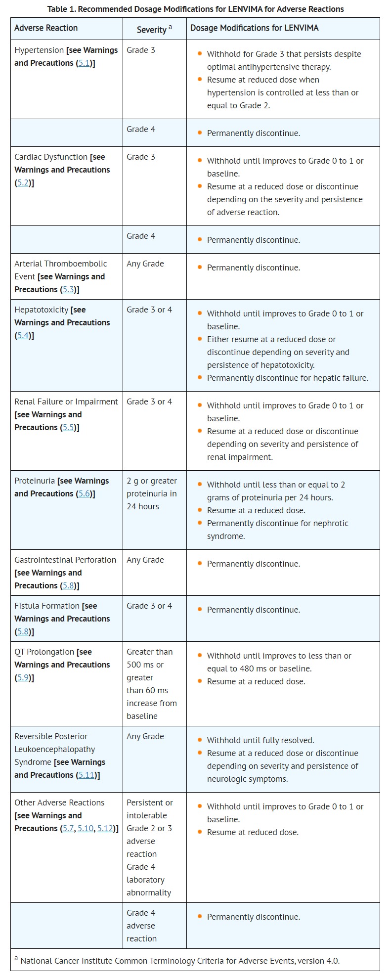 • Initiate prompt management of diarrhea or dehydration/hypovolemia. Withhold and resume at a reduced dose upon recovery or permanently discontinue LENVIMA for renal failure or impairment based on severity [see Dosage and Administration (2.6)].