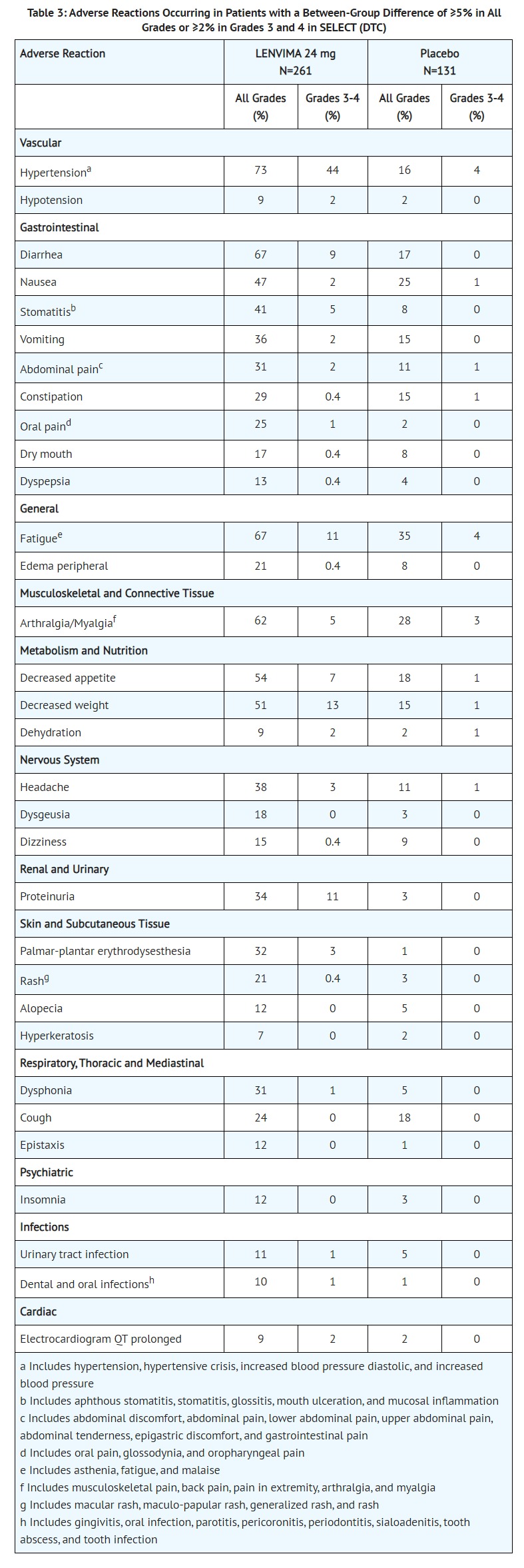 • In SELECT (DTC), QT/QTc interval prolongation occurred in 9% of LENVIMA-treated patients and QT interval prolongation of >500 ms occurred in 2%. In Study 205 (RCC), QTc interval increases of >60 ms occurred in 11% of patients receiving LENVIMA with everolimus and QTc interval >500 ms occurred in 6%. In REFLECT (HCC), QTc interval increases of >60 ms occurred in 8% of LENVIMA-treated patients and QTc interval >500 ms occurred in 2%.