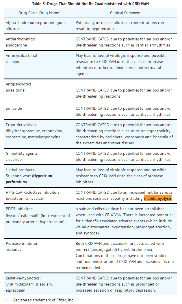 • Concomitant use of CRIXIVAN with lovastatin or simvastatin is contraindicated due to an increased risk of myopathy including rhabdomyolysis. Caution should be exercised if CRIXIVAN is used concurrently with atorvastatin or rosuvastatin. Titrate the atorvastatin and rosuvastatin doses carefully and use the lowest necessary dose with CRIXIVAN. (See PRECAUTIONS, DRUG INTERACTIONS.)